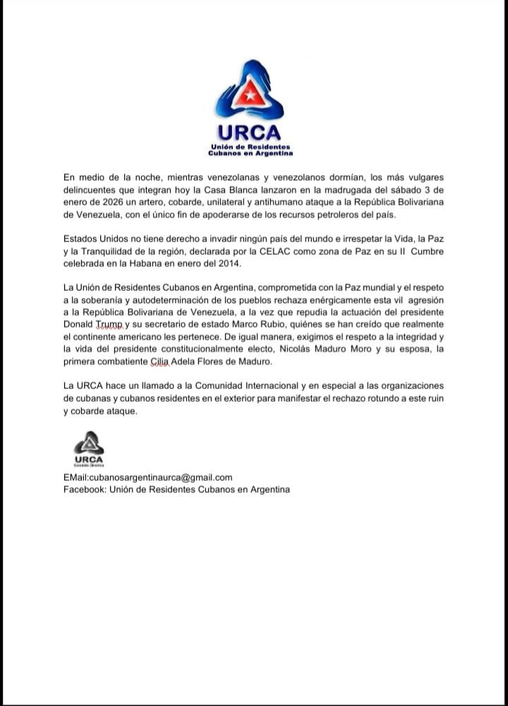 Declaración de la Unión de Cubanos Residentes en Argentina contra la agresión a Venezuela