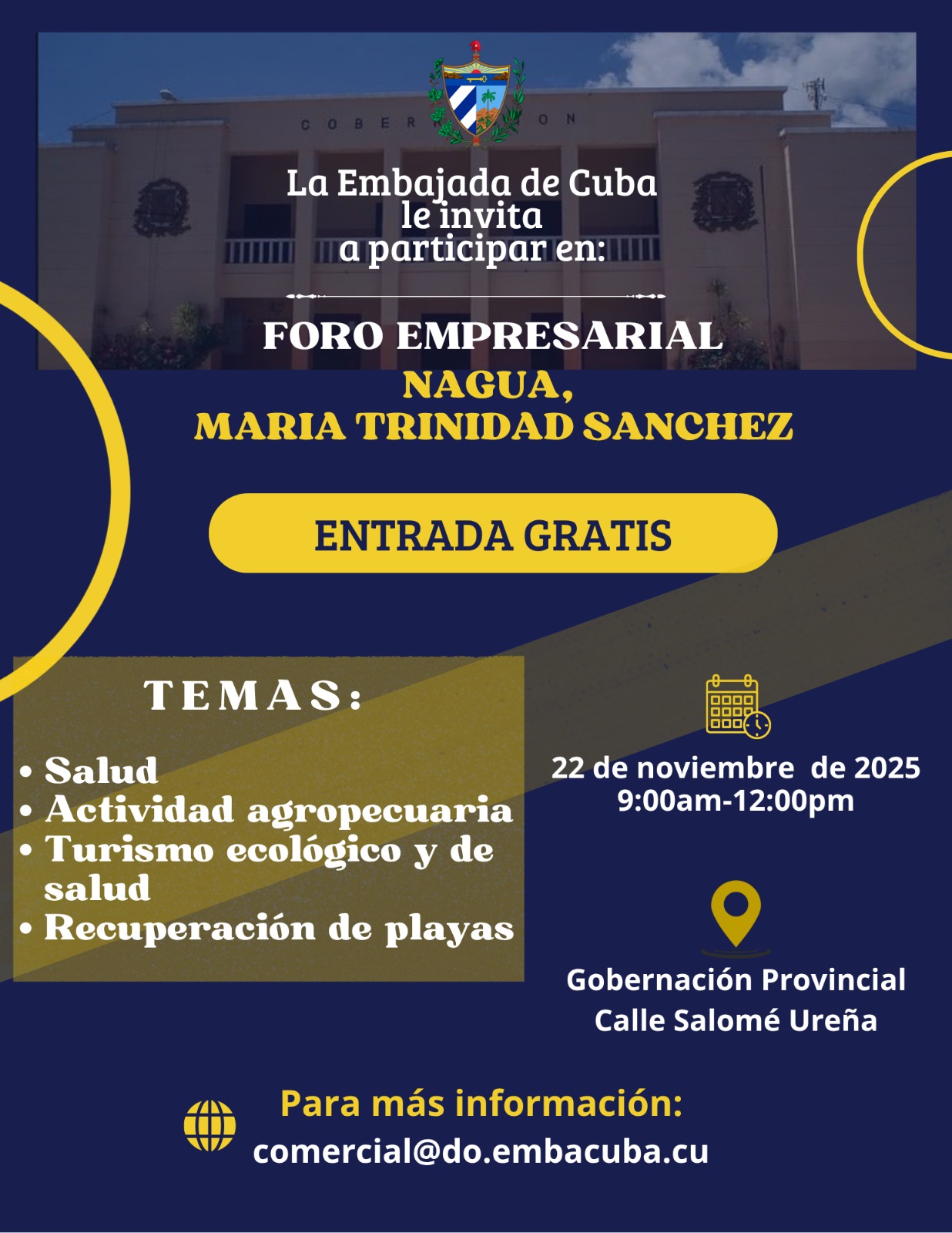En horario de 9:00 de la mañana a 12:00 del mediodía, la Embajada de Cuba encabezará el Foro Empresarial Nagua, María Trinidad Sánchez, un espacio de diálogo y cooperación orientado al desarrollo sostenible. El evento, de entrada libre, abordará temas estratégicos como salud comunitaria, actividad agropecuaria, turismo ecológico y de salud, así como recuperación de playas. La iniciativa busca promover alianzas en sectores clave, fomentar el intercambio de experiencias y visibilizar el potencial productivo y turístico de la provincia.
