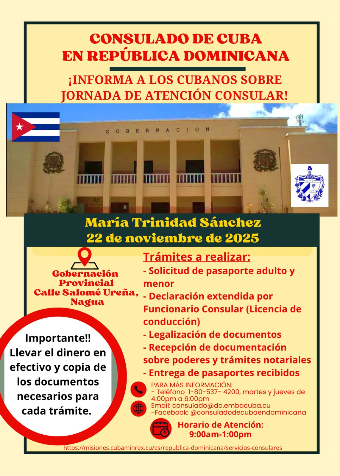 La Embajada y el Consulado de Cuba en República Dominicana desarrollarán este sábado 22 de noviembre una jornada conjunta en la ciudad de Nagua, provincia María Trinidad Sánchez, con el propósito de fortalecer los vínculos diplomáticos, económicos y comunitarios entre ambas naciones. Las actividades se llevarán a cabo en la Gobernación Provincial, ubicada en la calle Salomé Ureña, y estarán abiertas tanto al público en general como a ciudadanos cubanos residentes en la zona.