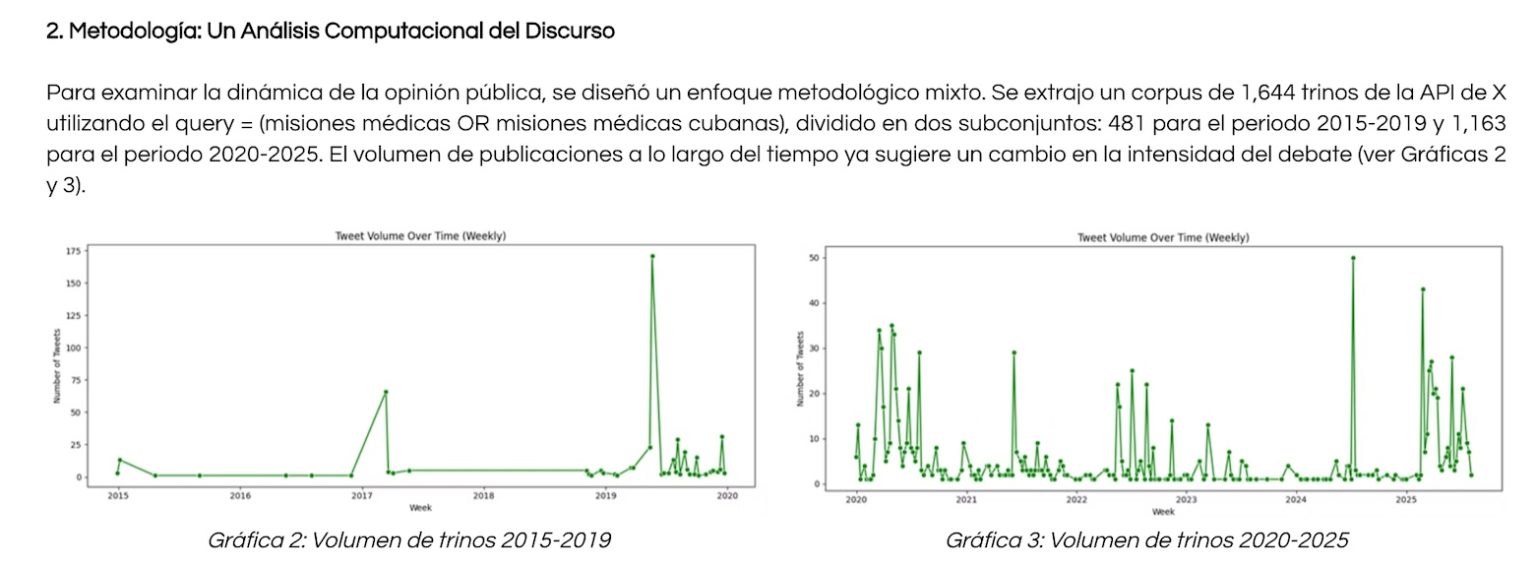 "Para examinar la dinámica de la opinión pública (sic), se diseñó un enfoque metodológico mixto. Se extrajo un corpus de 1,644 trinos de la API de X utilizando el query = (misiones médicas OR misiones médicas cubanas), dividido en dos subconjuntos: 481 para el periodo 2015-2019 y 1,163", dice 4Métrica.
