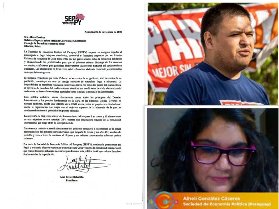 Por tanto, la Sociedad de Economía Política del Paraguay (SEPPY) condena la persistencia del ilegal y arbitrario bloqueo económico que pesa sobre Cuba y exige a la comunidad internacional que realice todos los esfuerzos necesarios para levantar esta política hostil que vulnera derechos fundamentales de la población.